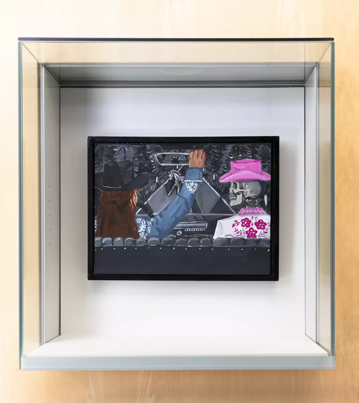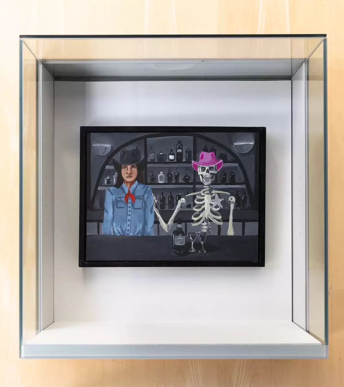"My series of paintings, The Bogeyman, explores the strangeness of nightmares and the shifting sense of identity that comes with living through these unreal timelines. Through recurring characters, the works form a twisting, disordered narrative in which a cowgirl becomes trapped in a world of horror drawn from both movies and everyday anxieties. The settings feel familiar yet slightly off, evoking unease and a dark, almost absurd humour as if things couldn’t possibly get any worse.