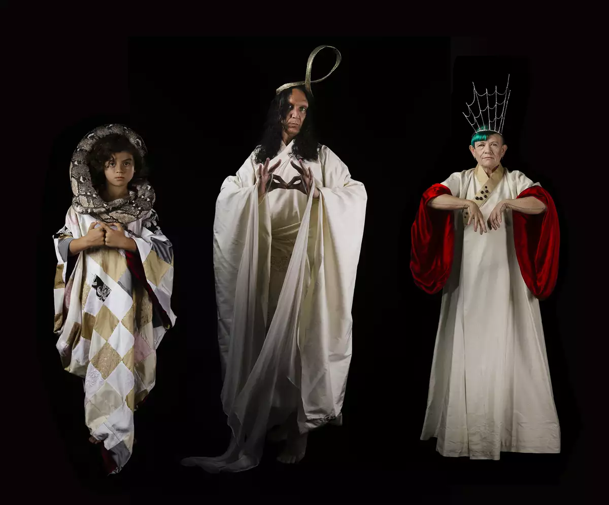 Image: Deborah Kelly, CREATION Lismore Luminaries Regalia Portraits. Noah Mead-St Clair: The Serpent, Elyatta-Adelaide Manton: Infinity, AñA Wojak: The Spider. Courtesy Deborah Kelly. Photo: Mia Forrest.