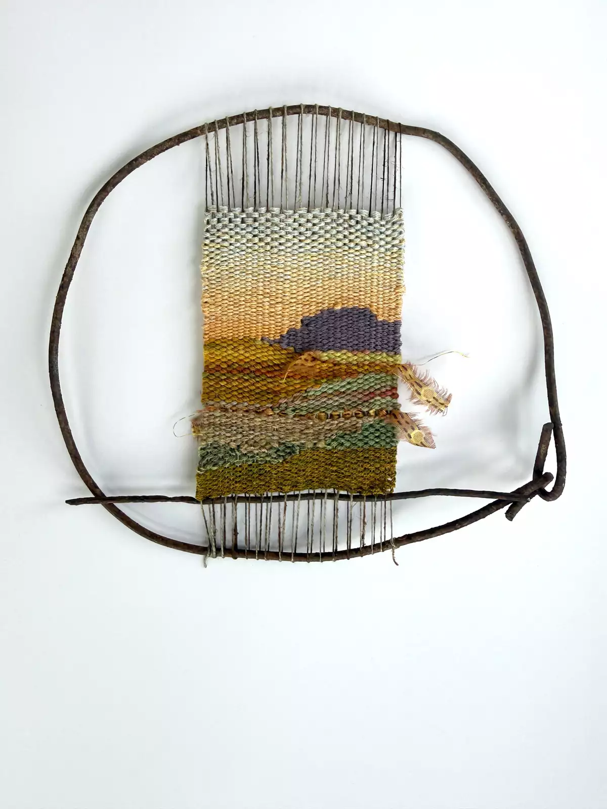 Image: Heather Dunn, 'Another Sunset', 2025, woven tapestry, found wire, linen, cotton, and silk, 20 x 25 cm. Courtesy the artist.